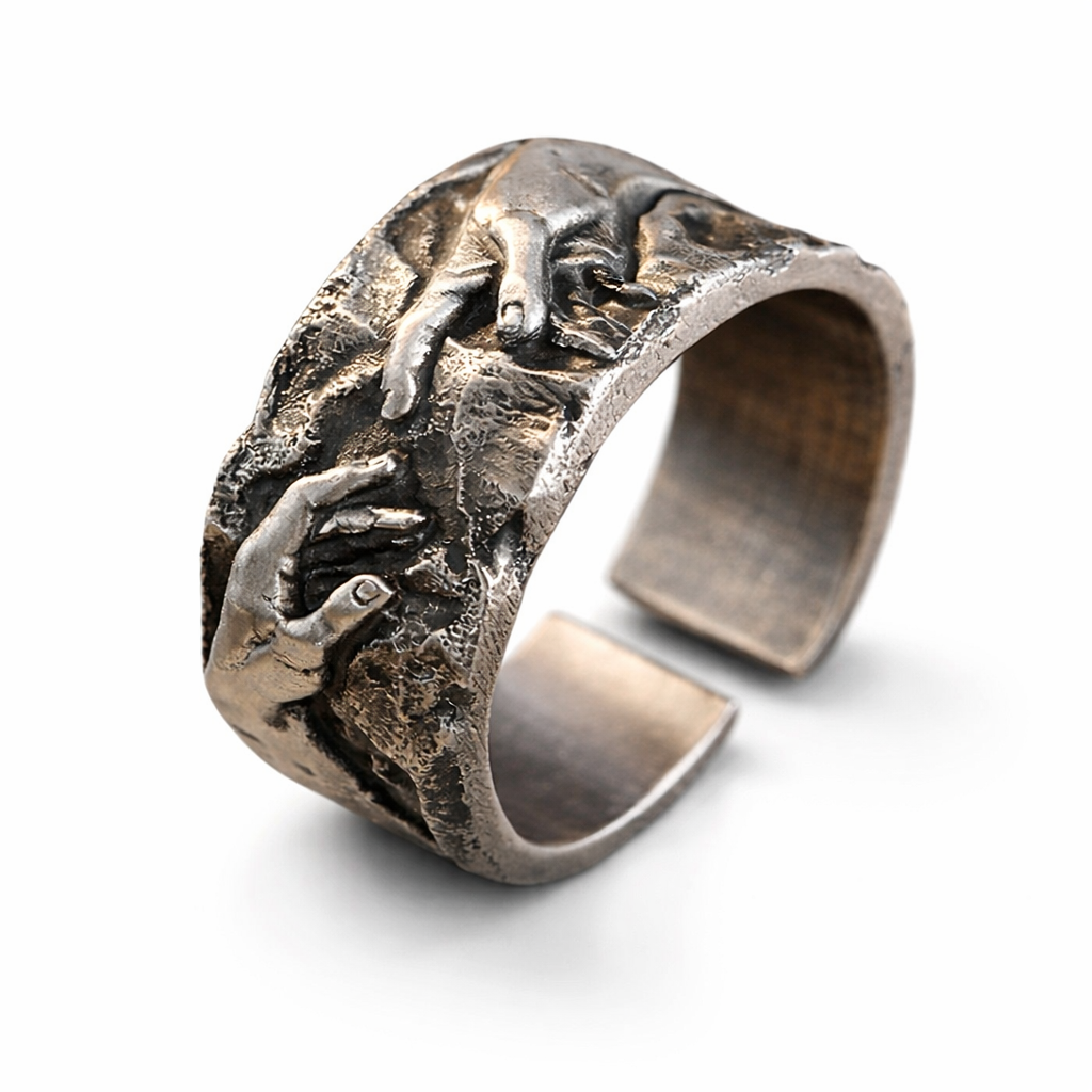 A striking antique-finish cuff ring featuring a sculpted hand motif and raw textured detailing. Designed for those who love statement jewelry with an artistic edge, this adjustable ring adds a powerful, unconventional touch to any look.